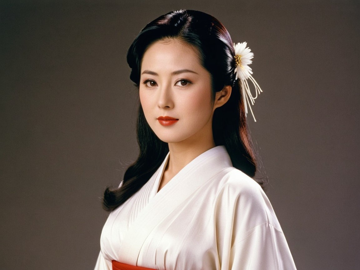 A woman in a traditional kimono poses elegantly, featuring long, dark hair adorned with a decorative flower. Her makeup is flawless, emphasizing her serene expression against a muted background.