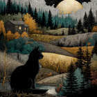 A black cat gazes at a bright full moon over a serene landscape, with a cozy cabin nestled in vibrant autumn foliage and tall trees against a starry sky.