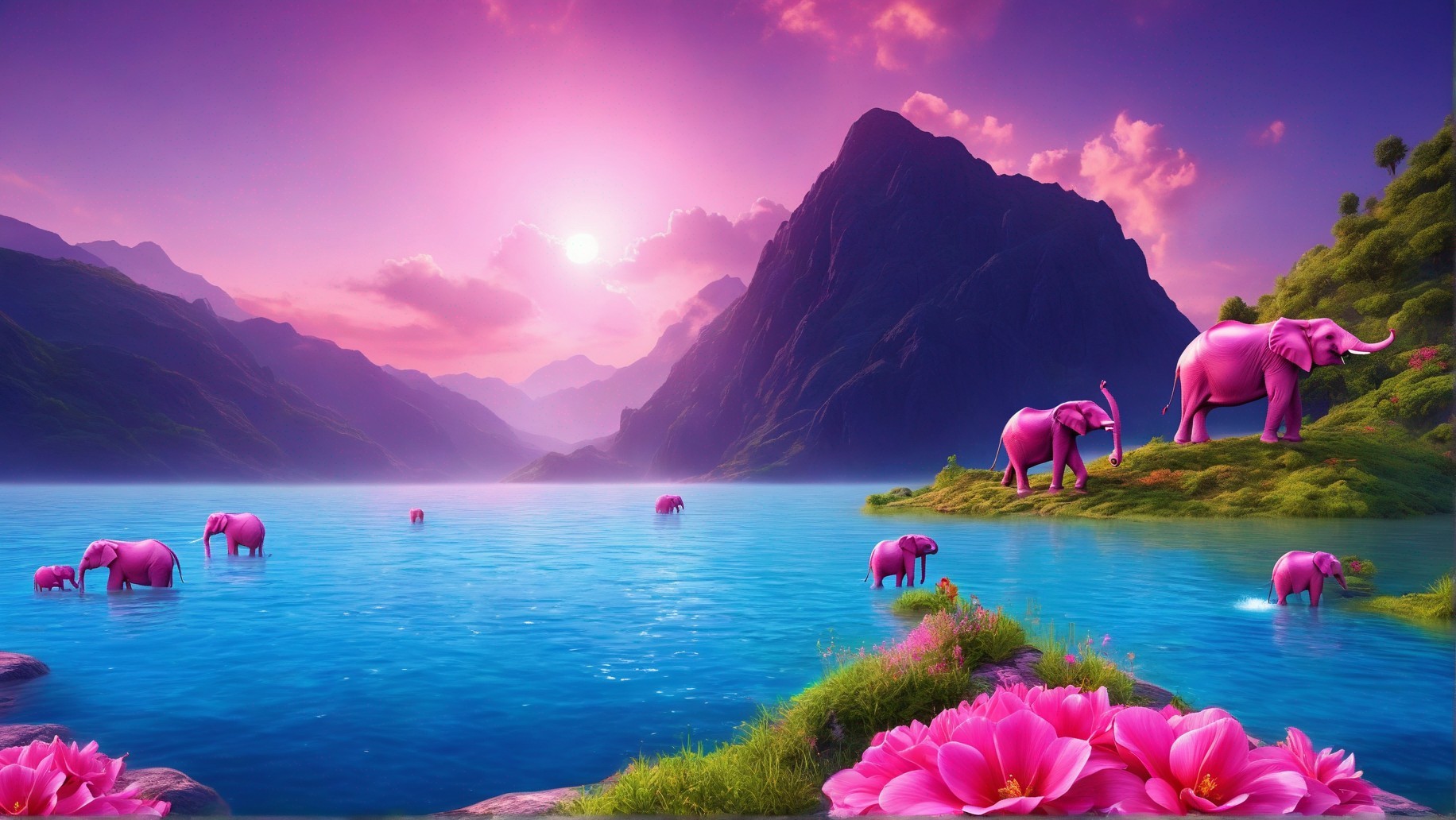 Beautiful pink elephants bathing in a gorgeous mountain lake on sunrise.