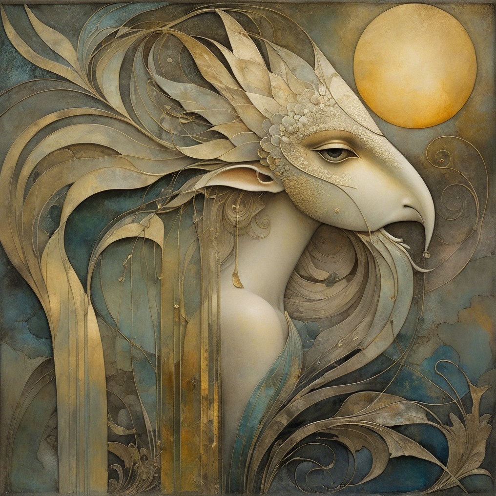 The artwork features a serene, stylized female face with flowing hair, set against a textured background and a radiant golden sun, blending elements of nature and emotion in cool tones.