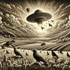 A serene, moonlit landscape features silhouetted trees and crows against a starry sky. Soft clouds drift above rolling hills, capturing a tranquil, dreamlike atmosphere in dark tones.