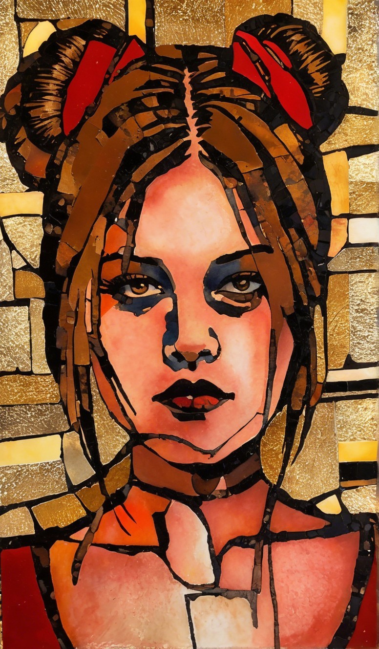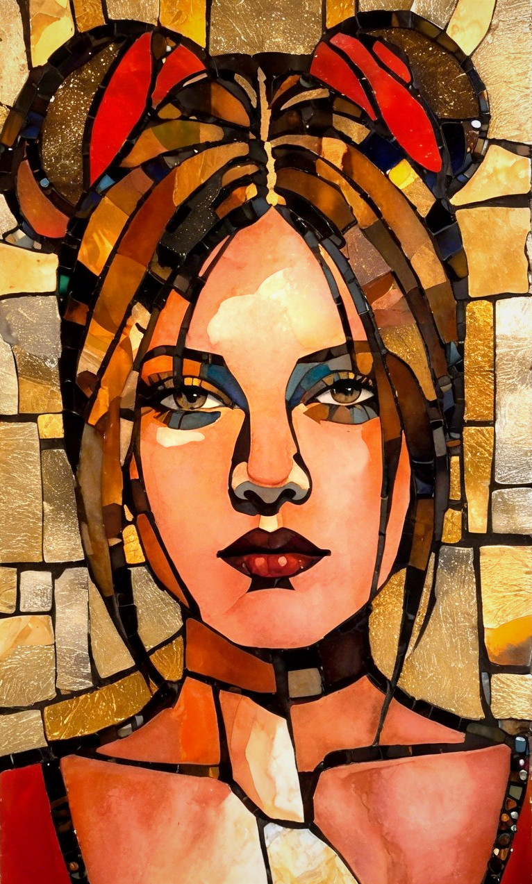 Intricate watercolor and ink portrait, fantasy realm, scuffed-worn-scratched rough surface, glass mosaic illusion, detailed craftsmanship, premium lighting effects, serene ambiance, layered textures, vintage tones fusion, painterly brushstrokes, fantastic posture, acrylic texture depth, close-up view, inspired by William Bradley, hues by Ho Baron and Ed Binkley, blurred, rim lighting, smeary, surreal aesthetics by Ray Donley, interwoven textures, voluminous collagraphy print, reminiscent of Man Ray's style, color mastery by Gerald Brom.128K HDR, avant-garde artwork, strikingly colorful, brightness 1.3, zentangle, plasticity 1.1, emulsion shifts, dyed, trippy, warm toned, ethereal glow, reminiscent of comic book art, vibrant, magical atmosphere, linocut contourings, surreal, dreamlike setting, intricate linework,