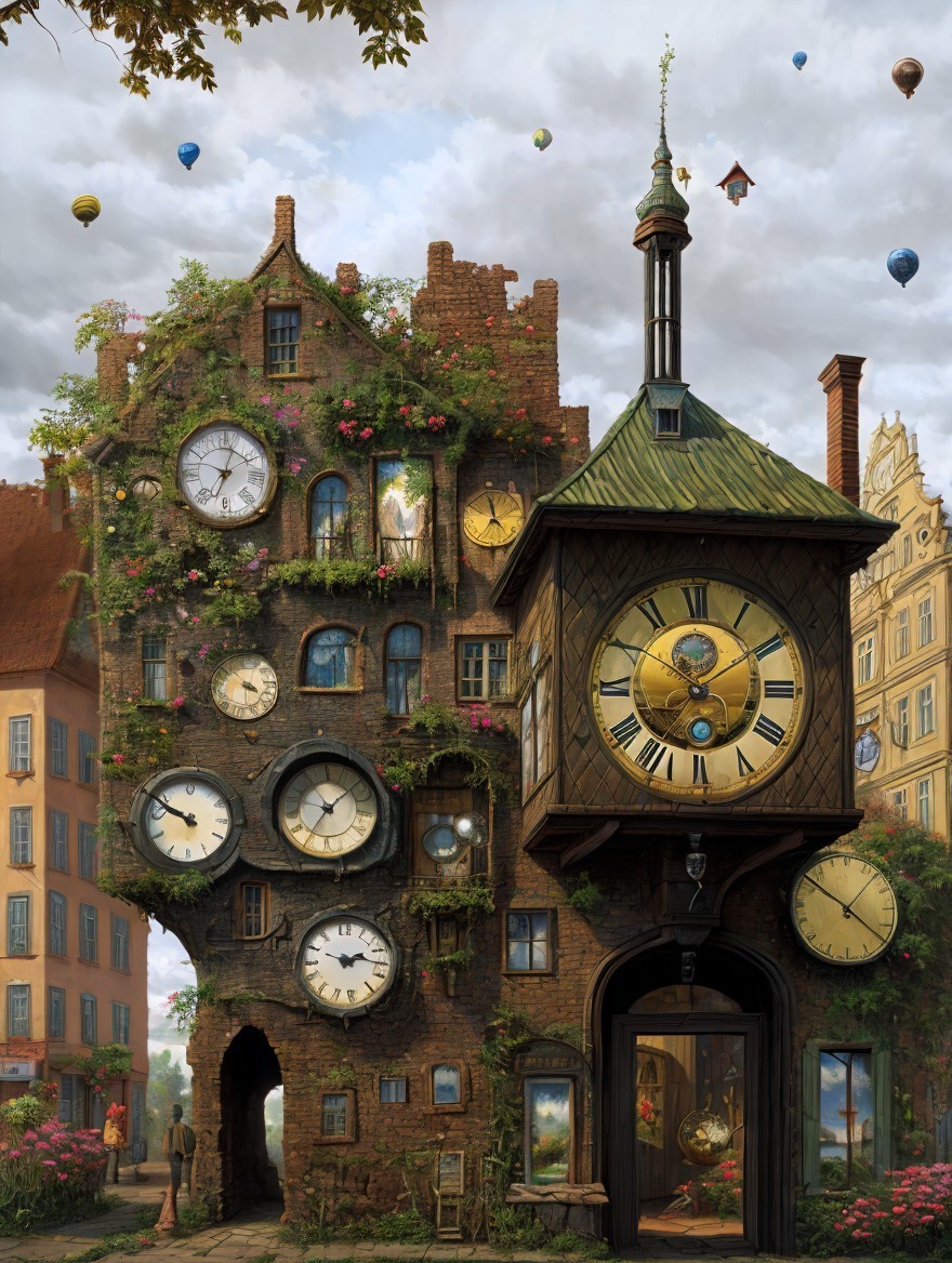 Clock-themed multi-story building with greenery, balconies, and multiple clocks under cloudy sky