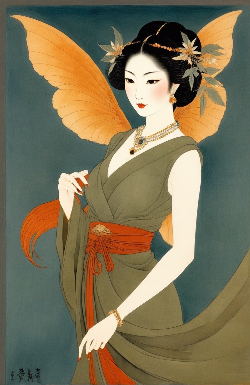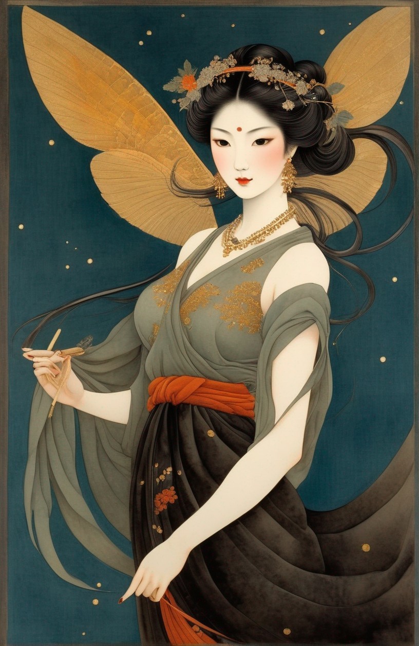 Her presence whispers of ancient tales, Like a breeze that through time sails. Elegant, poised, a gentle might, In her shadow, day turns to night". Medieval Japanese Artists Sumi-e Style. 3rd century Persian miniature art, golden ochre, sage green, pearl grey, paprika, blue-grey, Velvet Black, Shabby, Dull Gold, Amber Gray, Golden Ratio, Surreal Fantasy, Elegant, High Definition Ultra Fine 3D Line, Zenangle Style, Watercolor Patchwork , Arthur Rackham Style, Paul Kidby, , Jacek yerka, Extremely Detailed, Intricate, Thoughtful, HDR, Fractal, Beautiful, Award Winning, Fantasy Look, Fantasy, Crisp Quality