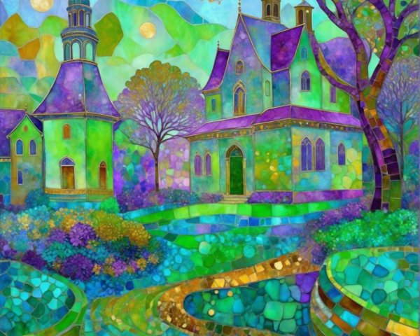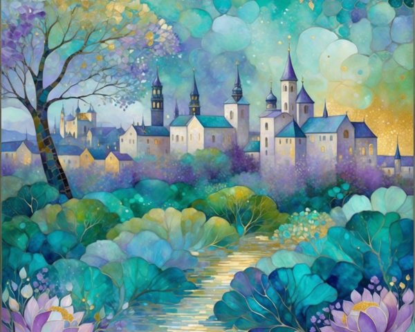 A vibrant landscape features bold colors and geometric shapes, showcasing a winding river, a towering rock formation, and trees with autumn hues under a radiant sun.