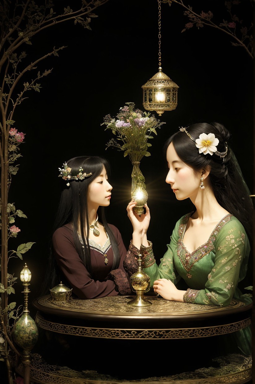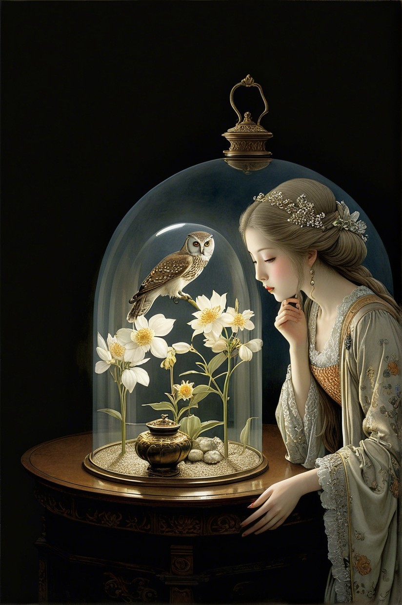 In an ornate mirror frame, a young girl and an elegant woman gaze at each other, holding a glowing lantern. An owl perches above, adding a touch of magic to the serene scene.