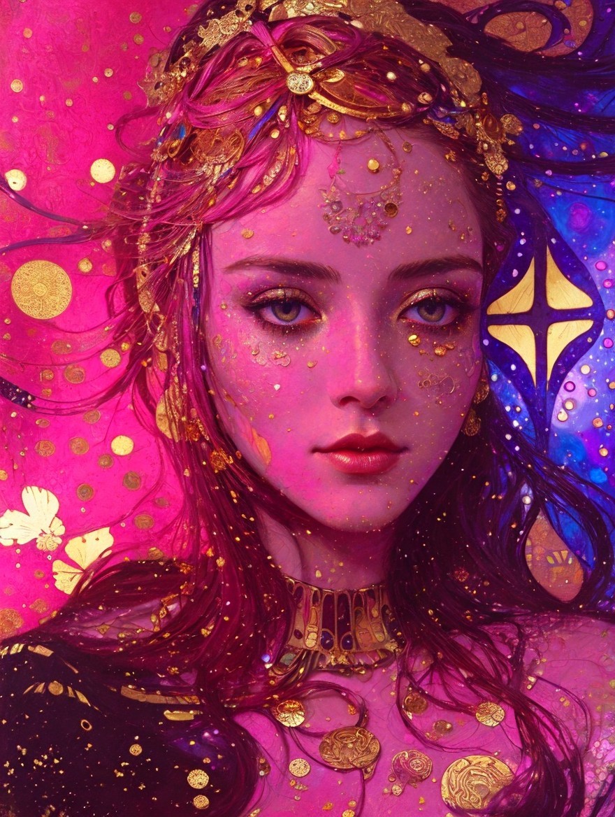 Stylized purple-skinned woman with gilded details and expressive eyes on pink and gold background