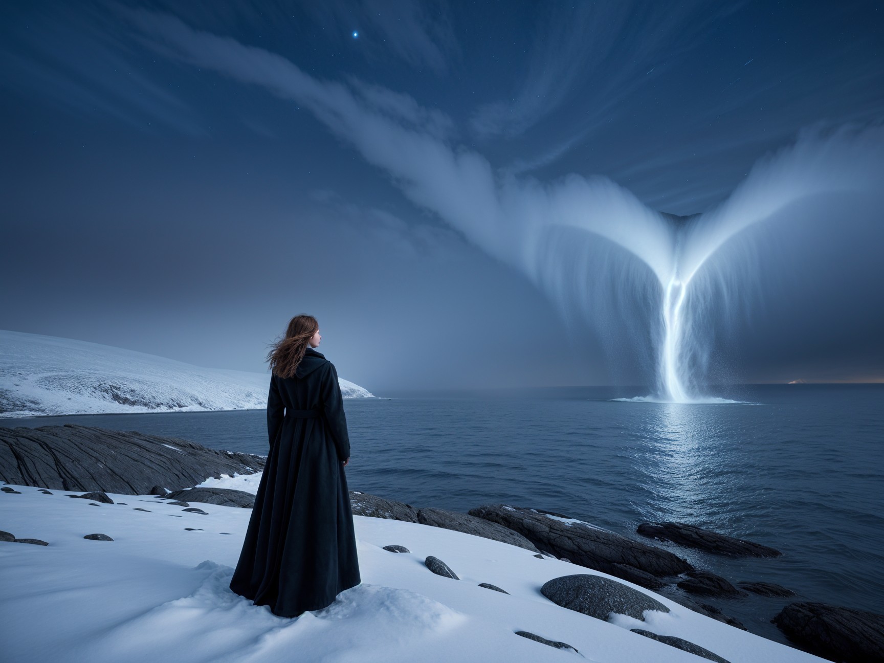 Prompt: "A young woman, wrapped in a flowing, long coat, stands in contemplative silence on a rocky, snow-dusted field, gazing up at a colossal, ethereal whale emerging from the heart of a gathering storm. The whale's majestic form undulates behind the clouds, partially illuminated by the soft glow of moonlight, with tendrils of mist swirling around its body. The serene winter landscape in the foreground contrasts with the dramatic, turbulent clouds overhead, creating a mystical atmosphere. Soft, golden light caresses the woman's silhouette, hinting at her awestruck expression. In the style of Zdzisław Beksiński's surreal, dreamlike landscapes, with the vibrant, emotive colors of Ash Thorp's digital art, and the haunting, atmospheric lighting of Simon Stalenhag's sci-fi illustrations. With emulsion lifts, wrapped in aluminum, latex membrane, and optical glitch anomalies, this image is a highly detailed, 8k, conceptual illustration, evoking a sense of wonder and unease. Cinematic film still, with film grain, vignette, and color grading, shot on a virtual v-raptor XL, with a 35mm film aesthetic, and live-action, atmospheric lighting, creating a masterpiece of dramatic, epic storytelling."