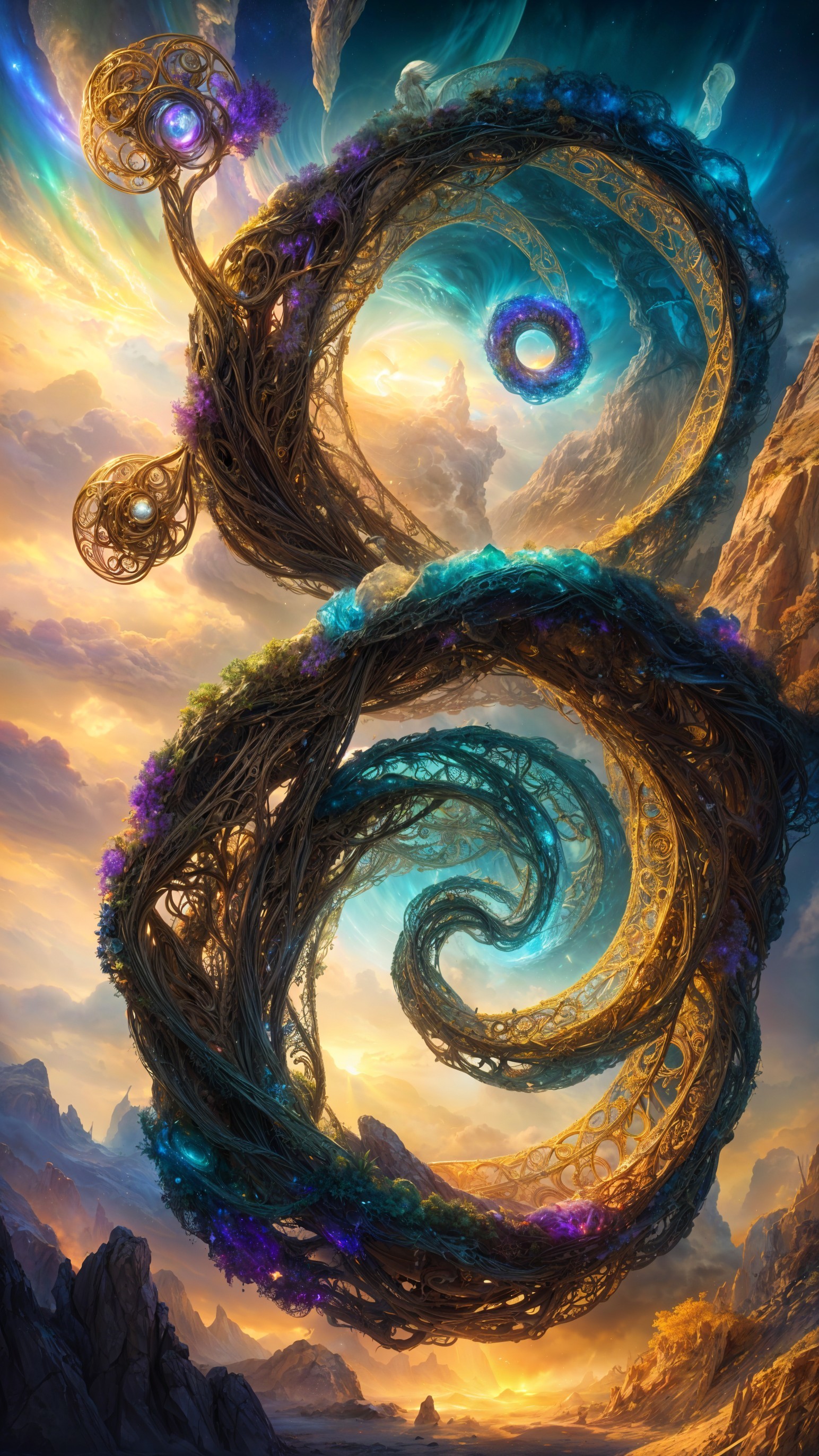 + Prompt:Eternal swirl of life concept, interwoven human life cycle, Möbius strip symbolism, birth to old age progression, intricate detailing, continuous evolution theme, awe-inspiring depiction, extraordinary creativity, magnificent presentation, digital painting style, fantasy elements integration, oil on canvas technique, cinematic lighting effects, high detail resolution, potential for awards, vivid color palette, cinematic post-processing, authentic feel, no exit from life theme, representation of fullness of time, masterpiece quality, pareidolia elements, AI composition, ArtStation showcase, elegant, intricate, dynamic lighting, 4K 3D, Unreal Engine, watercolor, eerie, surreal, mystic, unholy, ancient, Desert, moody, liminal, Epic, occult, celestial, hallucinogenic, melancholic, Mobius strip, haunted, insane, endless, sacred, Lavender, mad, end of the world, Eclipse, interdimensional, Authentic, Aurora Borealis, Gravity, Wistful, lunatic, Exalted, Antique light, Intoxicated, Copy image and enhance, ominous atmosphere, Winsome, Crossroads, Fullness of Time, Wild lightning, Breathtakingly beautiful, 4K 3D, Wild sky, Masterpiece quality, elegant, intricate, Eternal swirl of life, Eccentric!!!.