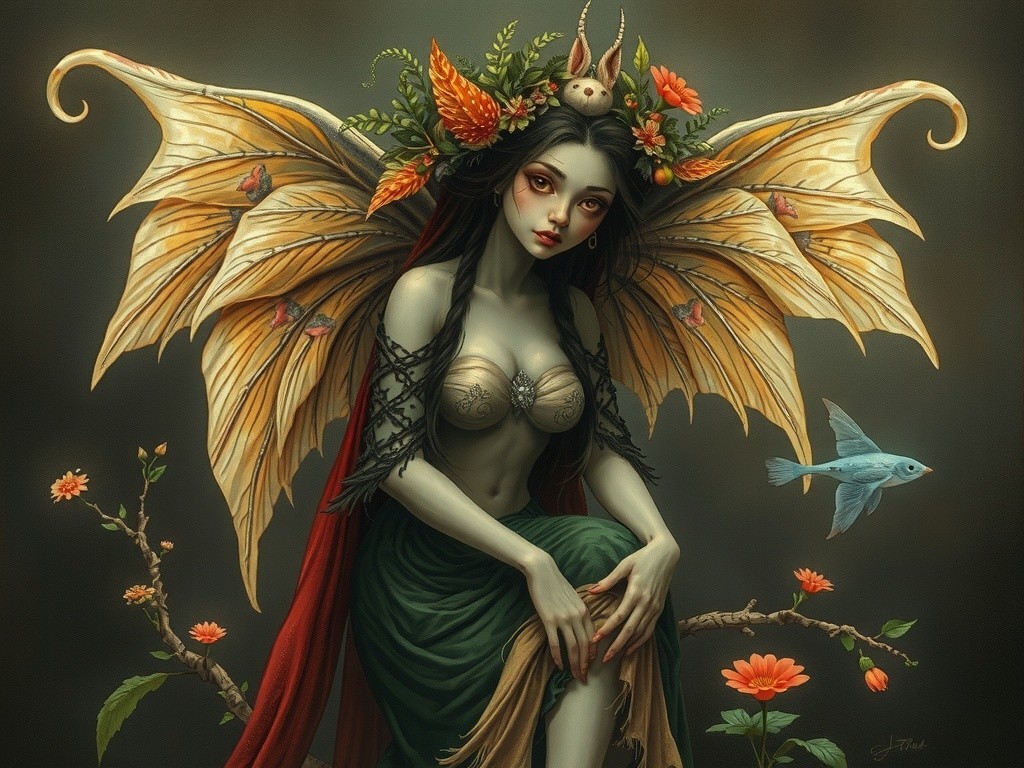 An ethereal woman with autumn leaf wings sits in a forest, accompanied by two foxes, with a mystical aura.
