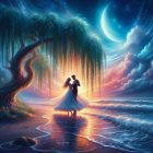 Two graceful figures embrace on a tranquil shoreline as vibrant colors of sunset illuminate the sky. A magnificent tree stands beside them, adding to the enchanting, dreamlike atmosphere.