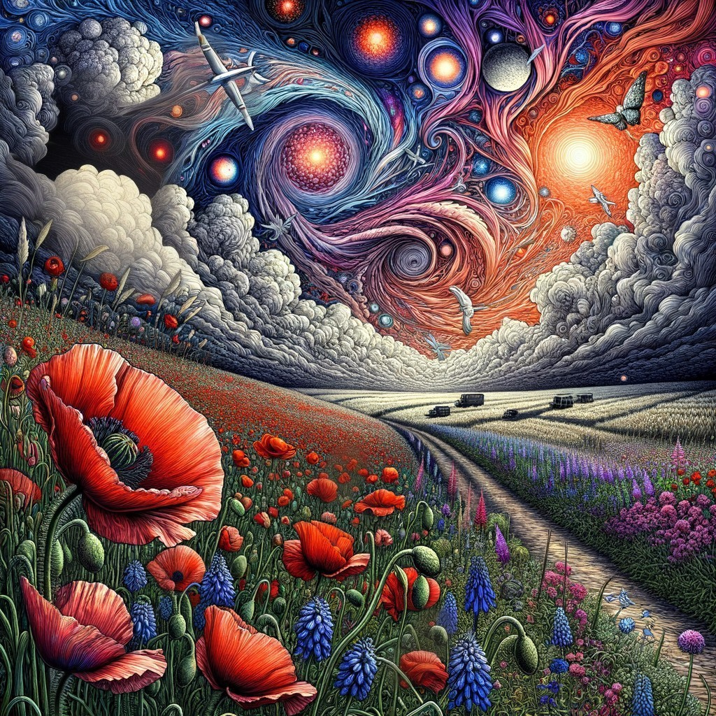 A vibrant surrealist artwork depicting a cosmic scene above a field of poppies, with swirling celestial patterns, a spacecraft, and whimsical elements.