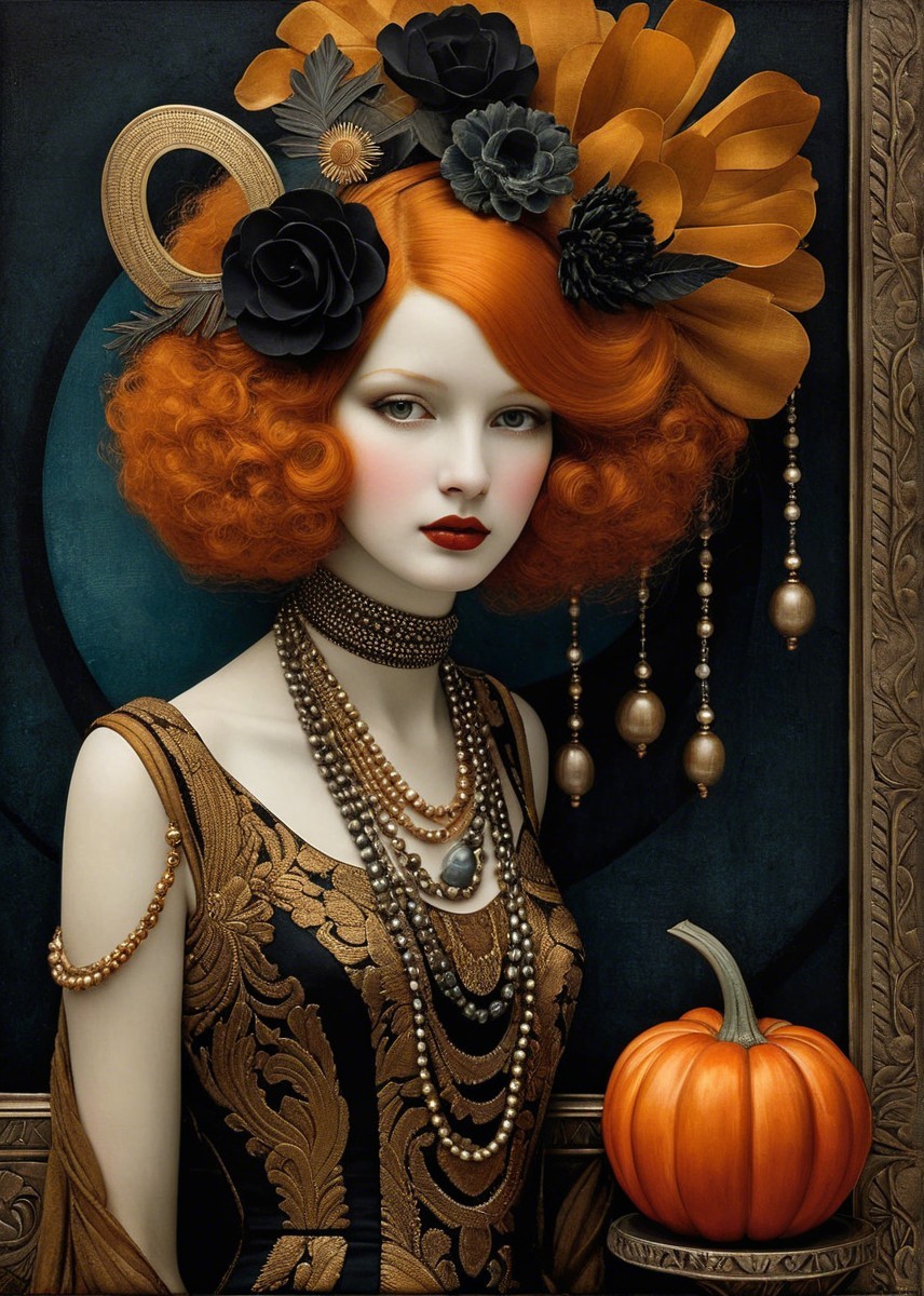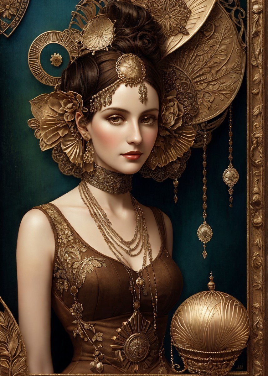 A woman in an elegant, gold-toned outfit with a decorative headpiece and a floral design. She poses against a backdrop of leaves and an artistic frame, exuding a vintage, glamorous vibe.