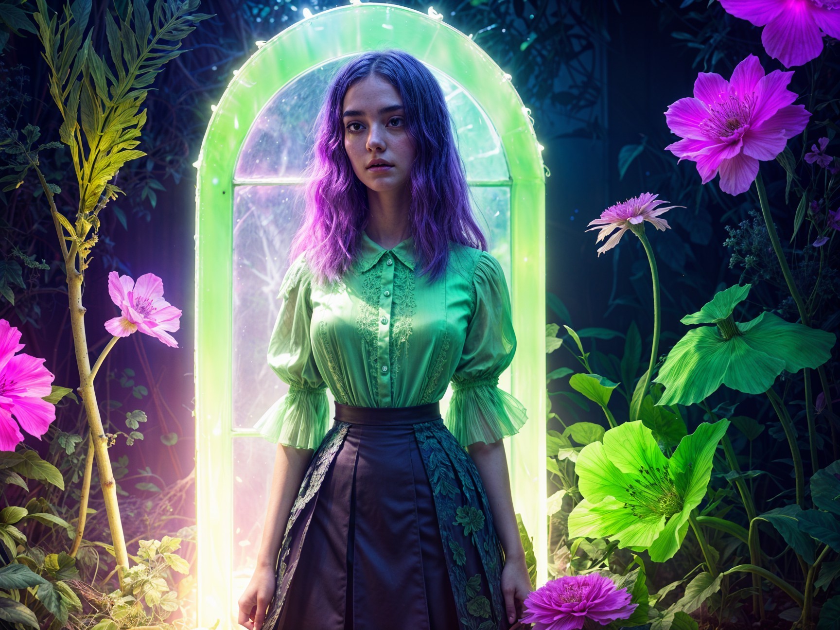 A young woman stands gracefully in front of a glowing window adorned with vibrant flowers and lush greenery, wearing a delicate lace blouse and a pleated skirt, creating a dreamy, ethereal atmosphere.