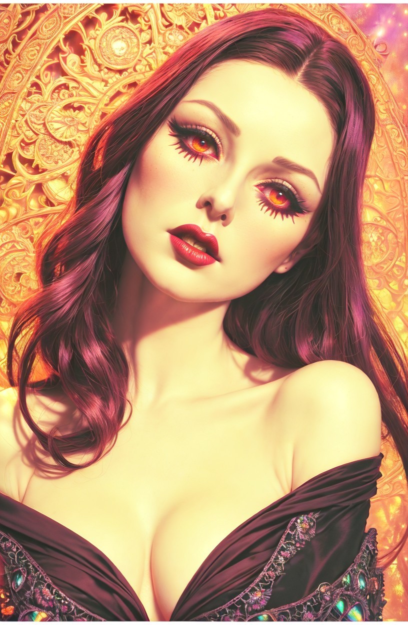 Style by Geoff Darrow and Margaret Keane: lady darkness, red glowing eyes, detailed fantasy, victorian goddess vampire. Extremely derailed, intricate, beautiful, fantastic view, 4K 3D, 3d effects 1.8, fractal background, full moon, shadow mapping 1.3, dynamic lighting 1.7, colorful iridescence, magical realism, scales, crochets, triadic color scheme beige ochre amber, comical sketch art by Overton Loyd, perfect handsface, highly chipped background, flares, grain, Anglocore 1.7, retrofuturistic details, high coloring 1.9, vector 9:5, bokeh, raytraced shadows, ethereal otherworldly psychpomp, acid spill, beautiful stylized composition, erotic essence, pink rim lighting from top to centre, gothic horror essence