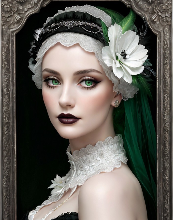 "Try it" from Enigmatic Beauty in Feathers https://deepdreamgenerator.com/ddream/crqaxp8xdp9 - A portrait of a woman with striking green eyes, black lipstick, a green hairpiece, framed by an ornate, vintage frame.