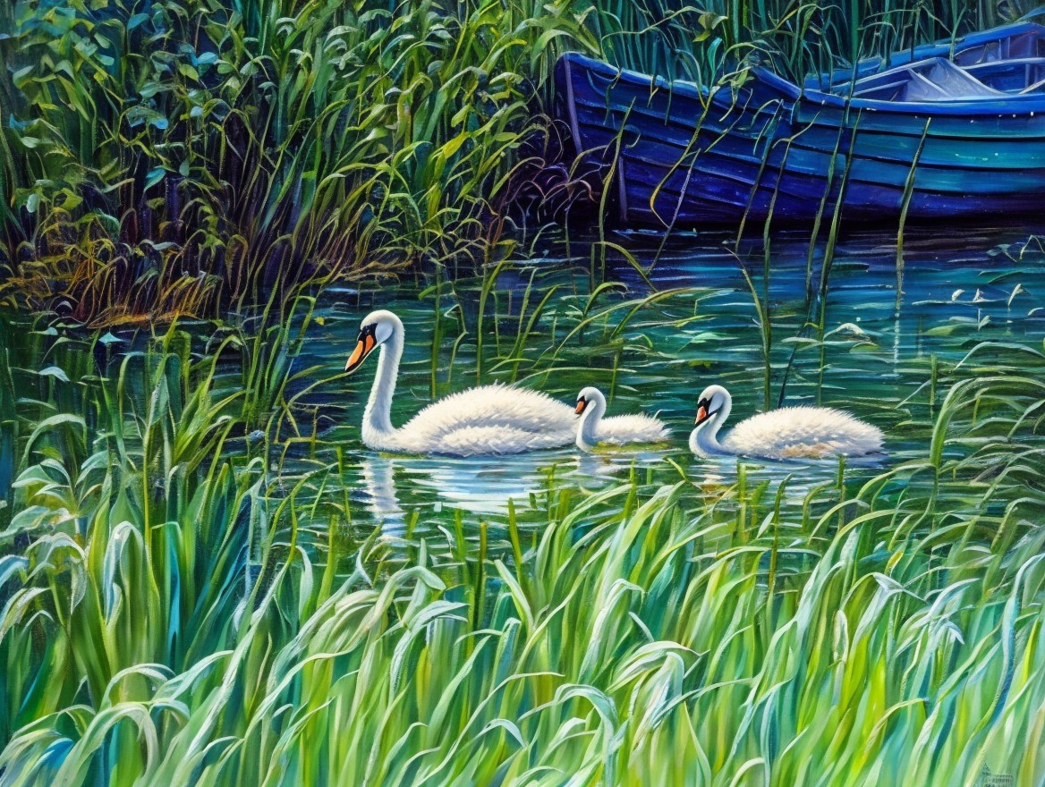Prompt: Acrylic art. Swan with chicks swims between green reeds in dark water, behind him a blue boat, bushes, trees, extremely detailed, intricate, inspired by Jan van Goyen