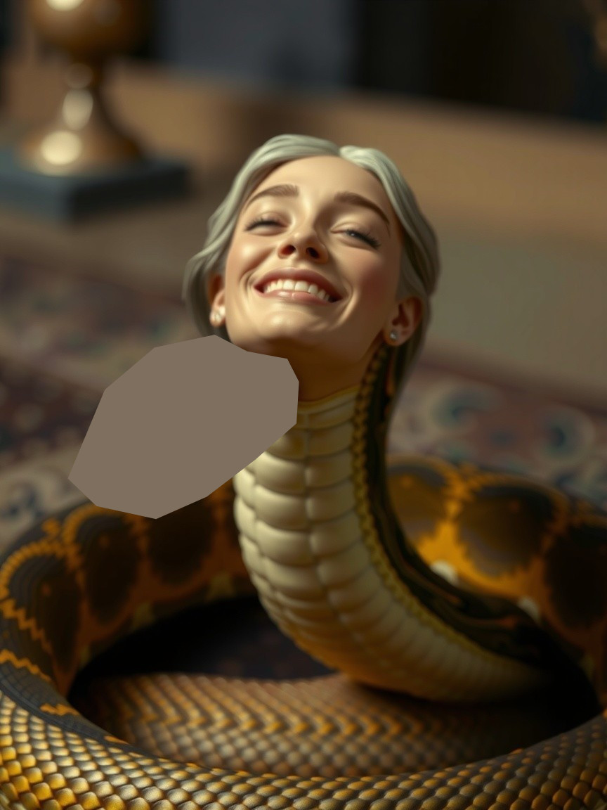A woman with a joyful smile appears to be partially entwined with a large, colorful snake, creating a surreal and captivating depiction of harmony between human and nature.