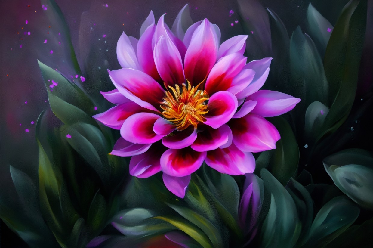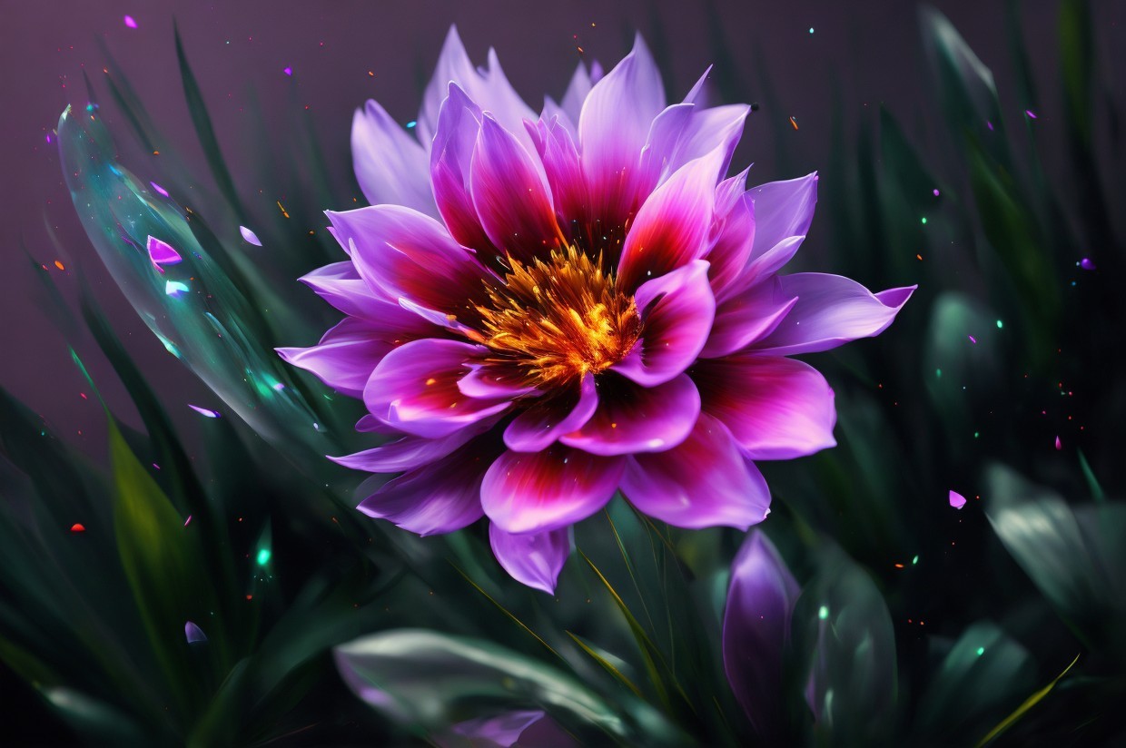 A vibrant digital artwork of a glowing, neon flower with fiery petals and swirling, illuminated elements on a dark background.