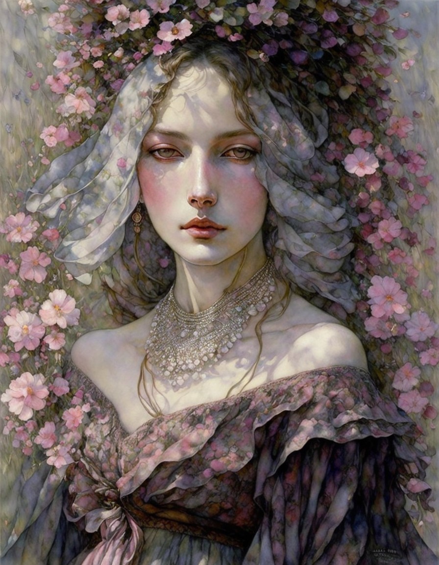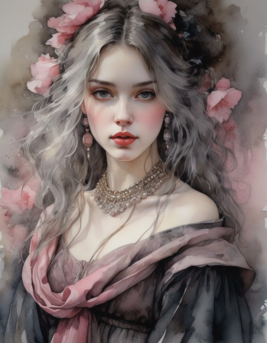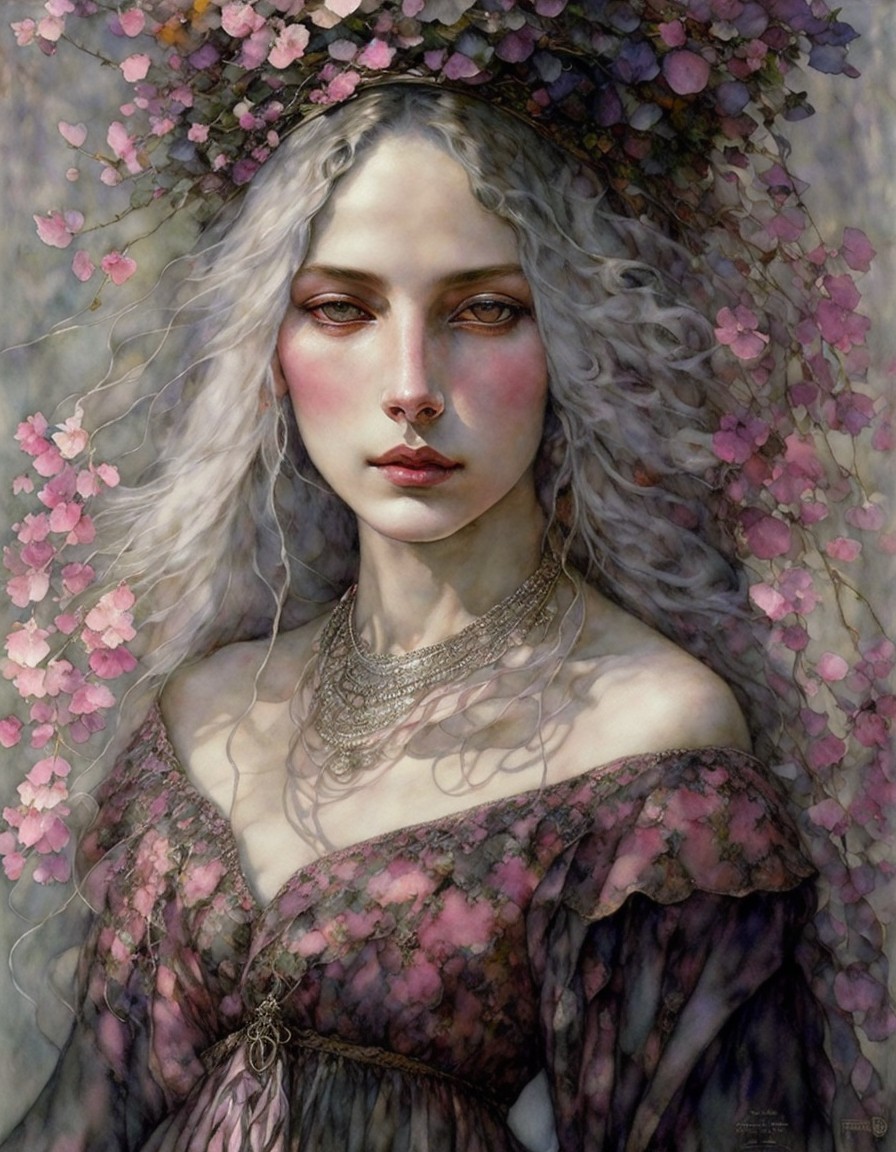 Young woman with gray wavy hair and pink floral adornments in pink and purple attire.