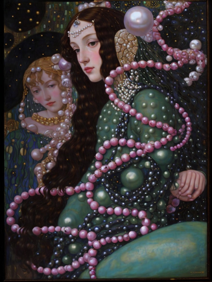 A graceful figure adorned with an array of pearls and gemstones, exuding elegance. The background features intricate patterns, enhancing the serene beauty and captivating allure of the subject.