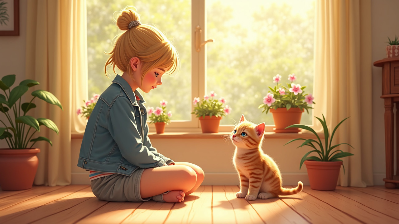 Prompt: "blonde girl loose bun denim jacket striped shirt shorts,sitting wooden floor bright sunlit room,tabby kitten playful interaction,potted flowers near window,warm golden light,innocence,companionship,vivid colors,modern impressionism meets anime aesthetics,Van Gogh brushwork,contemporary art,ultra detailed,8k hd wallpaper"