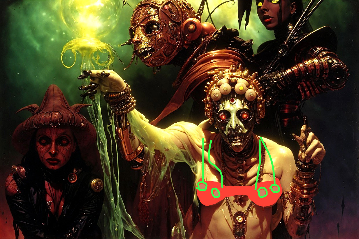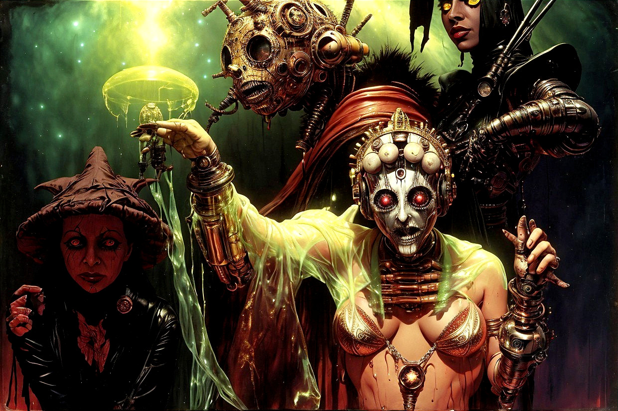 + Prompt:All on one image: Effects of heat on celluloid, cenobites and warlock, cybernetic disaster witch of evil, inspired by Clive Barker and H.R. Giger weirdness, flesh and gold brassiere,cosmic colorful background , wet collodion process of style of emil melmoth and by roger ballen, medium - format print, The wonderful work by Shintaro Kago, by Alexander Runciman, ffffound, nuclear radioactive particles, made of crystalized synapse, nineteenth century, artforum, goya, , Roberto Ribeiro Padula