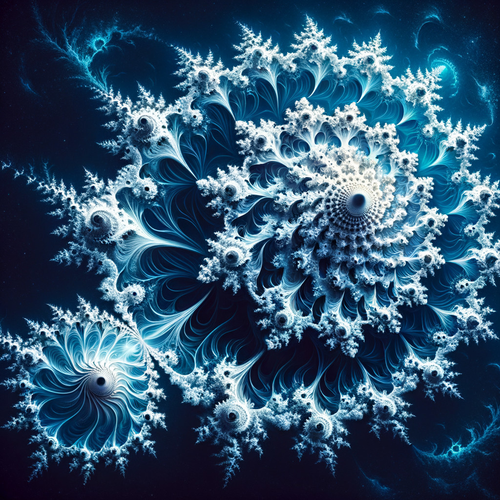 A fractal image with a spiral pattern in shades of blue, resembling a cosmic, icy fern or feathery wing.
