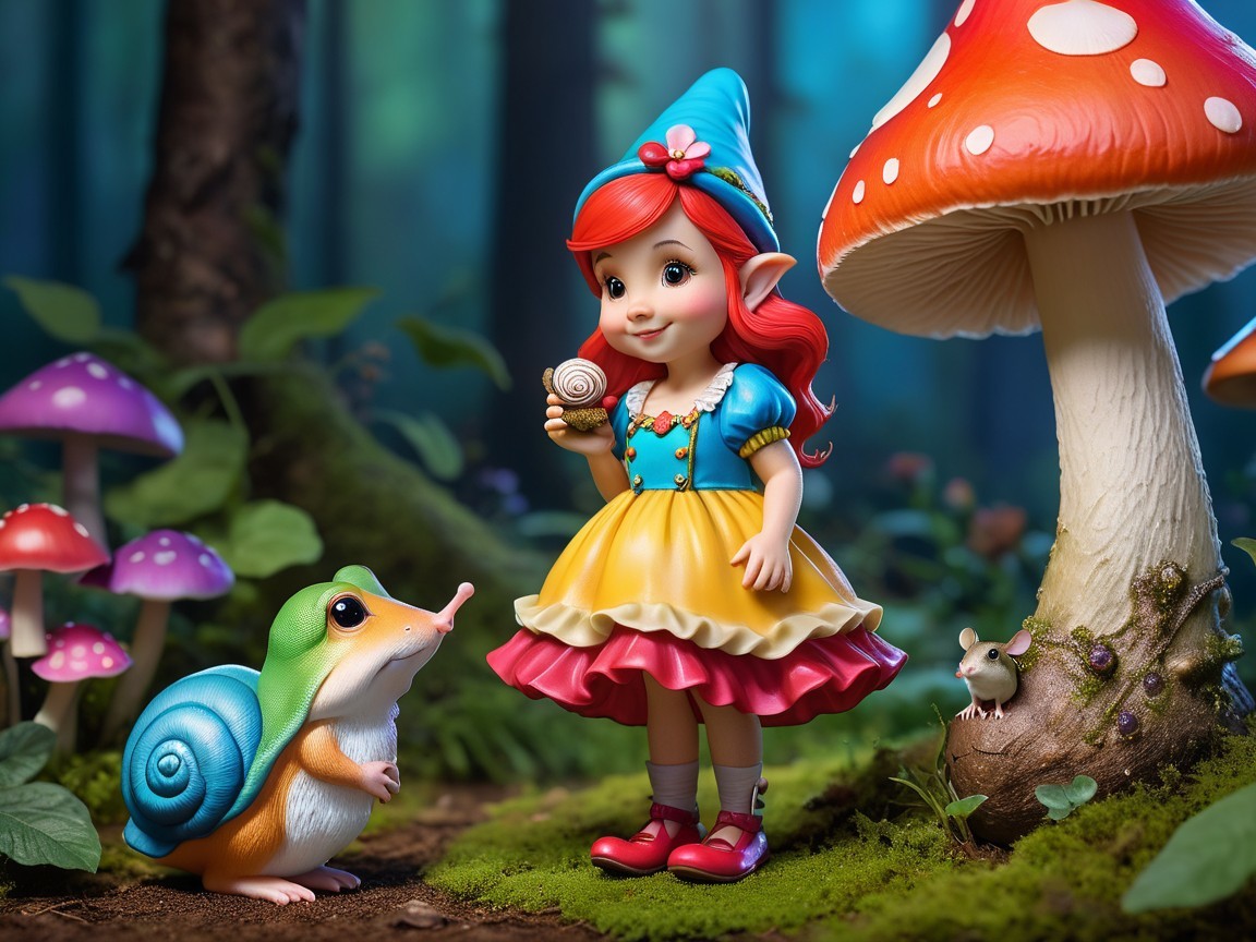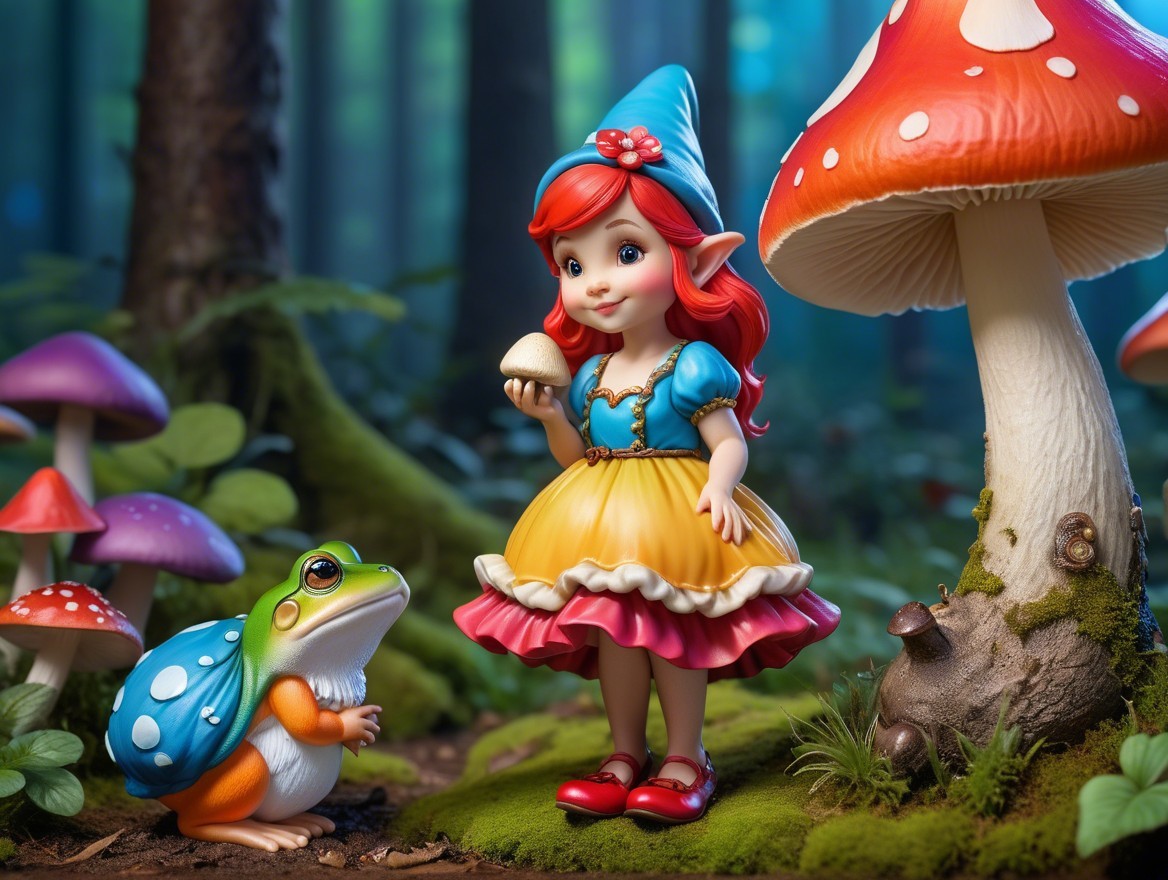 A whimsical scene featuring a cheerful fairy with red hair, wearing a colorful outfit, standing beside a friendly frog in a vibrant forest filled with oversized mushrooms.