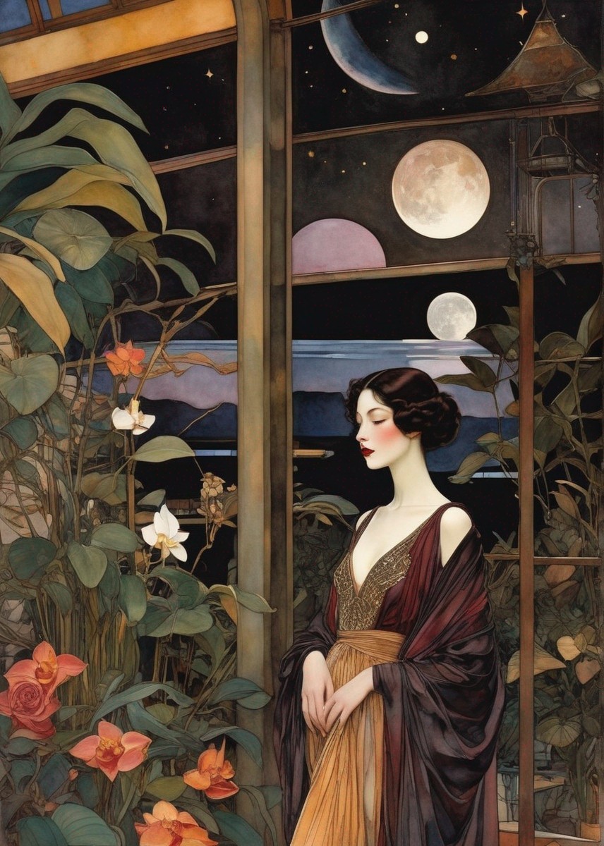 + Prompt:A stunning enchantress, adorned in an exquisite conservatory , engrossed in the examination of exotic plants and orchids under the gentle glow of a crescent moon.
