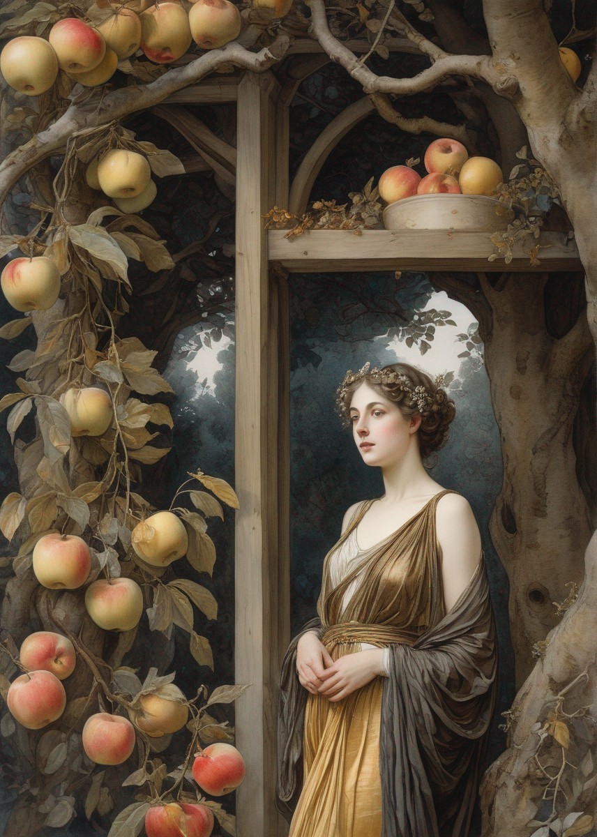 Prompt: Hesperides is a dryad similar to Epimenides, but they live within golden apple trees.