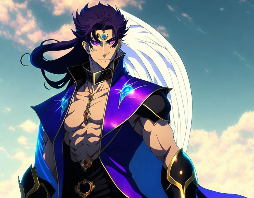 Animated character with flowing blue hair in ornate black and gold outfit against sky backdrop