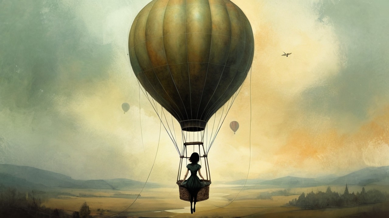 A solitary figure in a vintage hot air balloon ascends through a serene landscape. Soft hues of gold and blue create a dreamy atmosphere, evoking a sense of adventure and tranquility.