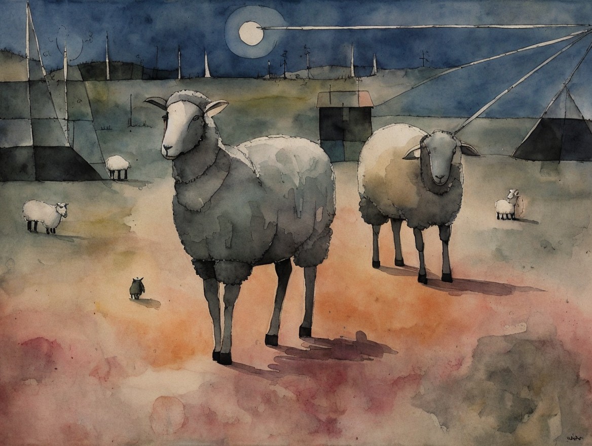 A geometric watercolor scene depicts stylized sheep and a deer in a tranquil landscape. Soft colors blend around them, creating a dreamy atmosphere with abstract shapes and muted tones.