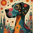 A vibrant, abstract portrayal of a dog features swirling colors and patterns, set against a whimsical backdrop of whimsical towers and celestial motifs, blending animal artistry with surreal architecture.