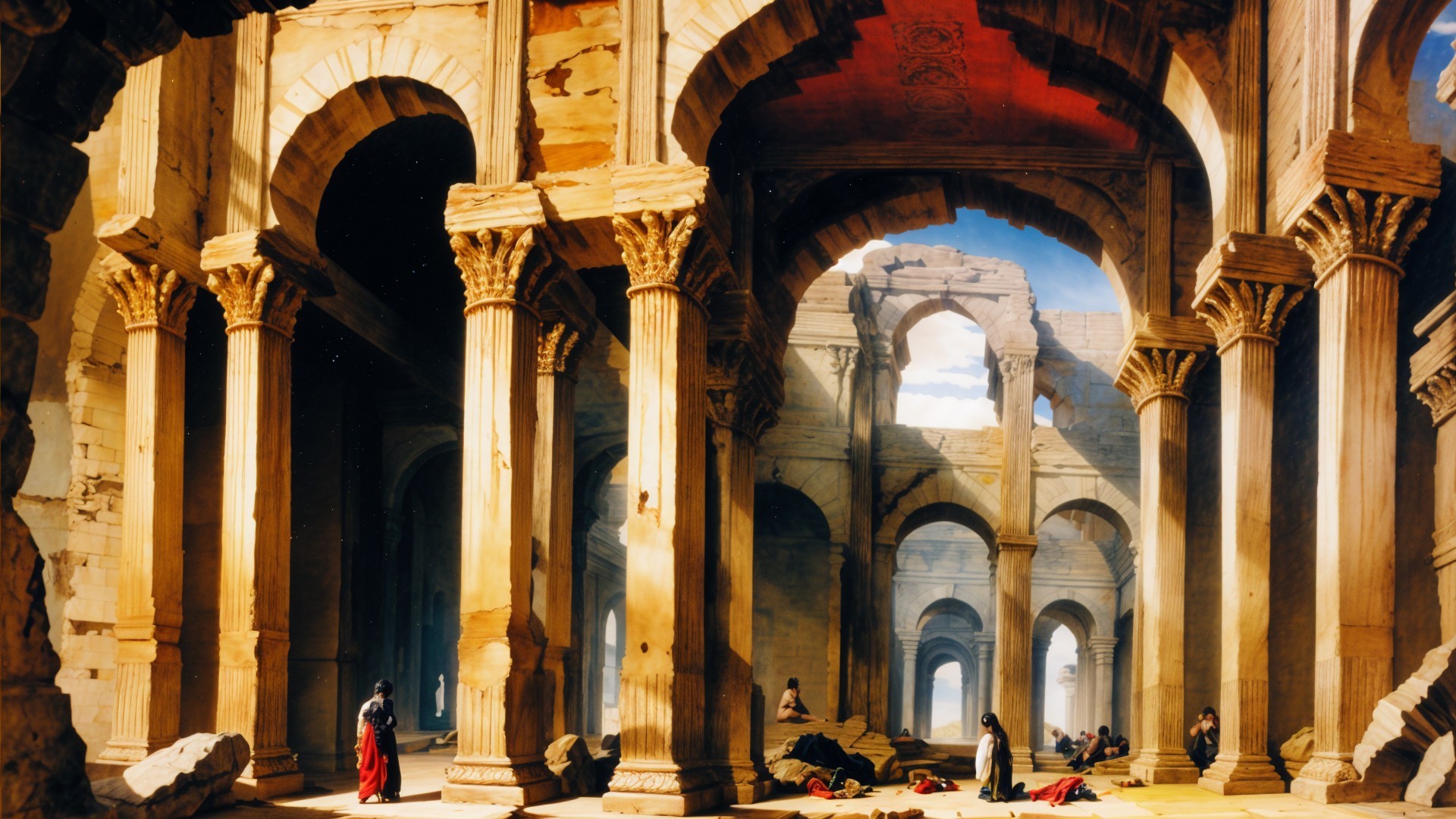 The scene depicts a grand ancient ruin with towering columns. Figures draped in red robes stand amidst scattered bodies, evoking a haunting atmosphere of desolation and timeless beauty.