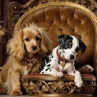Two adorable puppies sit on an ornate, vintage chair. One is a golden Cocker Spaniel with a red collar, and the other is a playful Dalmatian, both radiating charm in a luxurious setting.