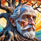 The image features a stylized elderly man's face emerging from a vibrant, colorful tree, with autumn leaves and a radiant, circular background, symbolizing wisdom and nature's connection.