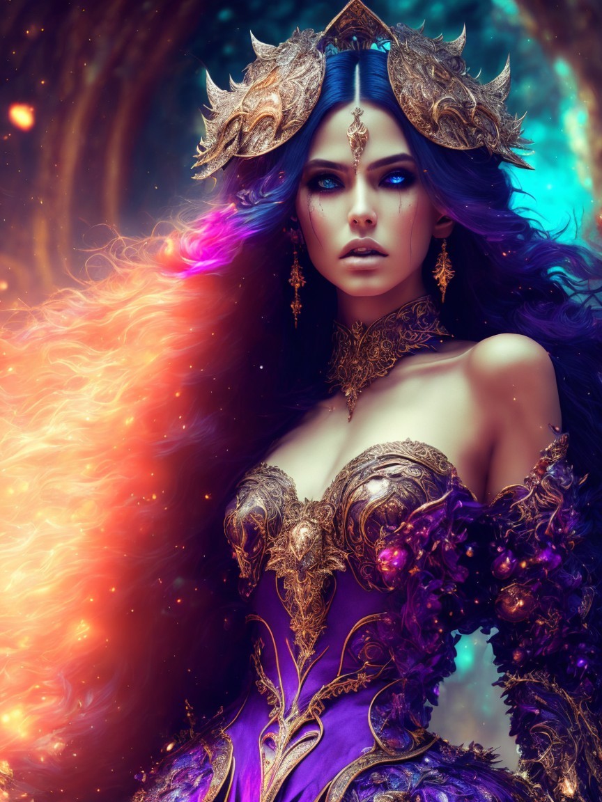 A stunning fantasy character adorned in intricate, golden armor with ornate details. Her long, flowing hair and captivating gaze exude power and elegance, set against a mystical, glowing background.