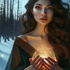 A mystical figure in a flowing green gown stands in a snowy forest, cradling a warmly glowing orb. Ethereal lights shimmer around her, creating a magical atmosphere in the serene, wintry landscape.
