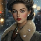 A glamorous woman with voluminous curls, wearing a stylish hat and a fur-collared coat. She's adorned with pearls and a floral brooch, set against a snowy, vintage street scene.