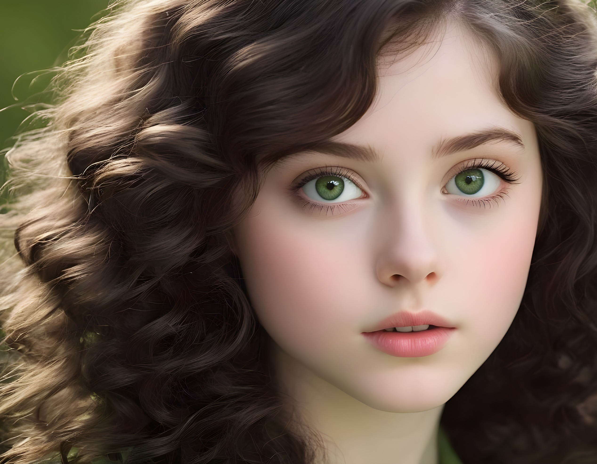 Portrait of a young woman with curly hair and striking green eyes, soft-focus background.