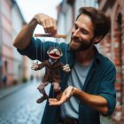 A smiling man holds a marionette puppet, dressed in a suit, as they pose together on a charming cobblestone street lined with colorful buildings. The scene is lively and playful.