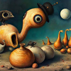 A whimsical scene featuring odd, bulbous figures resembling creatures and vessels, with large eyes, hats, and a small bird perched atop. The colored background enhances the surreal atmosphere.