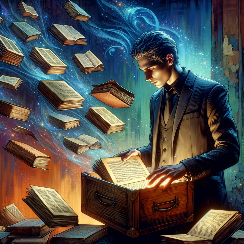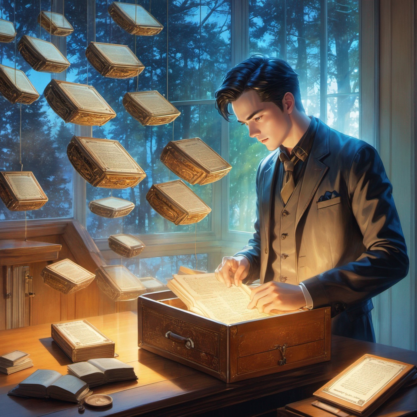 Prompt: "Opening a box, he found a stack of leather-bound old books. He read a few of the brittle age-darkened entries, all of them neatly written in black ink.Reading is healing me. Mystery, style by Thomas Wells Schaller, Maxfield Parrish and Ivan Bilibin, colourful, magical, beautiful, bioluminescent highlights and atmosphere, Daniel Merriam art station. Mystery, acrylic art, Art Deco, Annigoni, Egon Schiele, Botticelli, Catrin Welz-Stein, elegant, digital painting, concept art, smooth,Nikon D850 extremely detailed beautiful dynamic lighting colorful 3D Award winning photography fantasy 8k beautiful"
