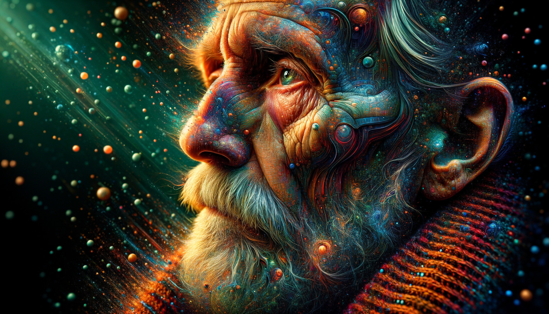 Elderly man with glasses and white beard in contemplation with glowing particles