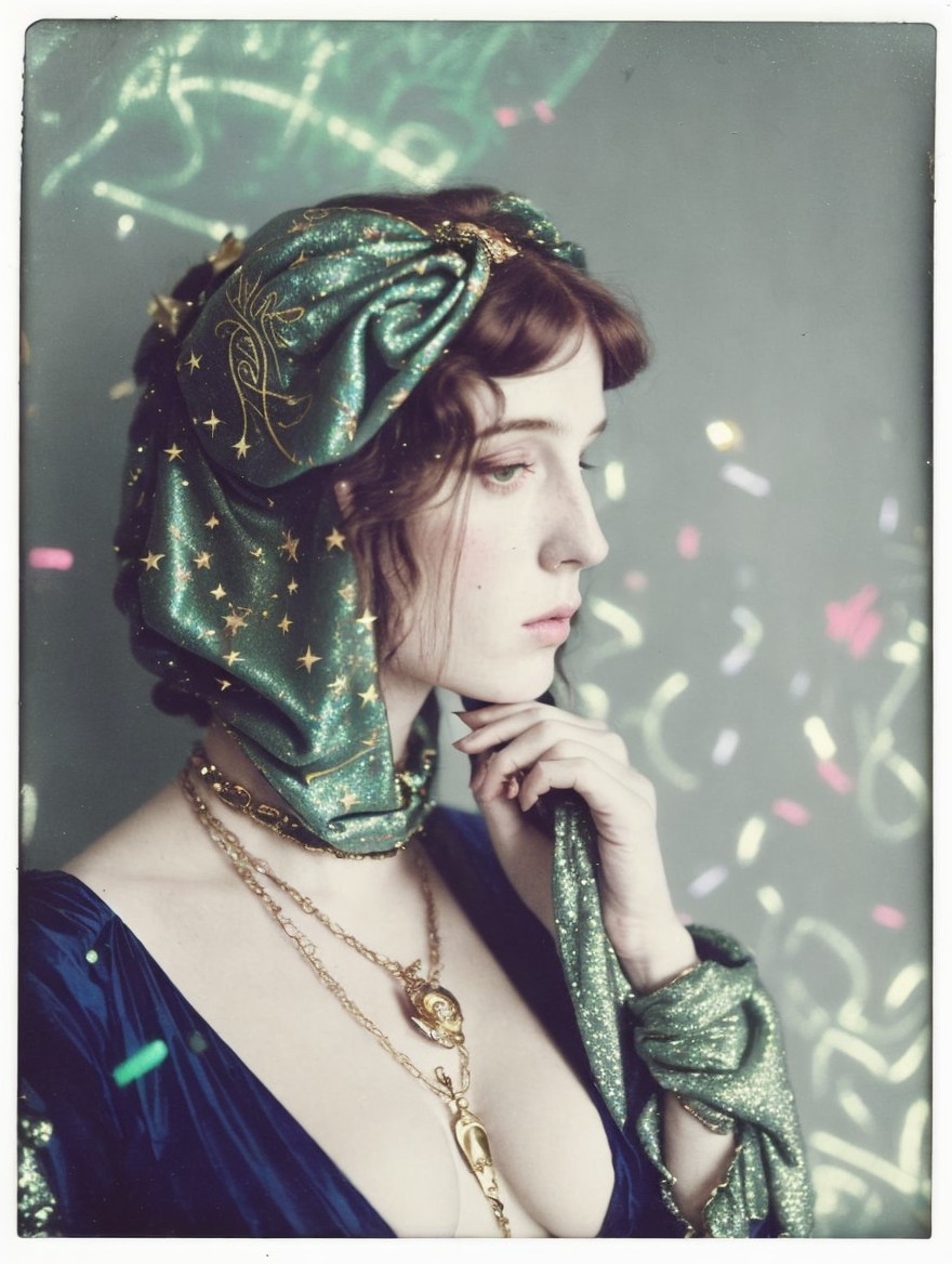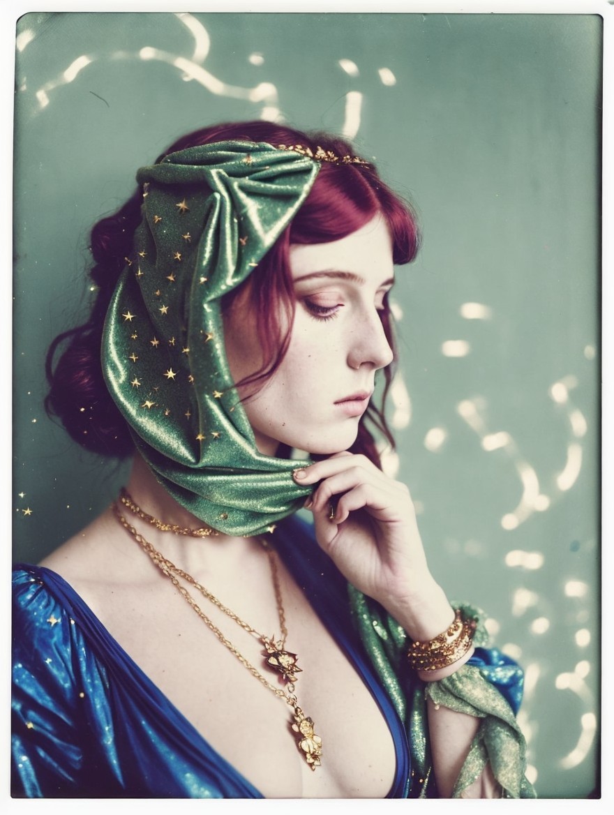 A contemplative figure with wavy red hair, draped in a sparkling green scarf and a blue garment, adorned with golden jewelry, poses against a softly lit background. The atmosphere is ethereal.