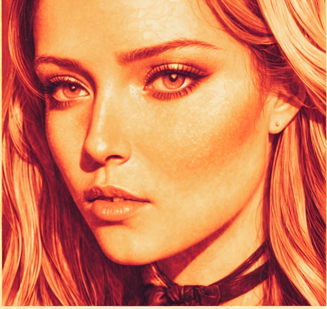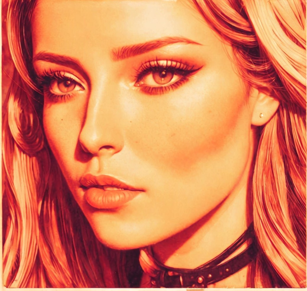 A stylized orange-hued portrait of a woman with prominent eyes, wearing a choker, gazing to the side.
