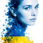 A captivating portrait of a woman with blue and yellow artistic elements swirling around her, evoking a sense of fluidity and emotion, with striking green eyes and a serene expression.