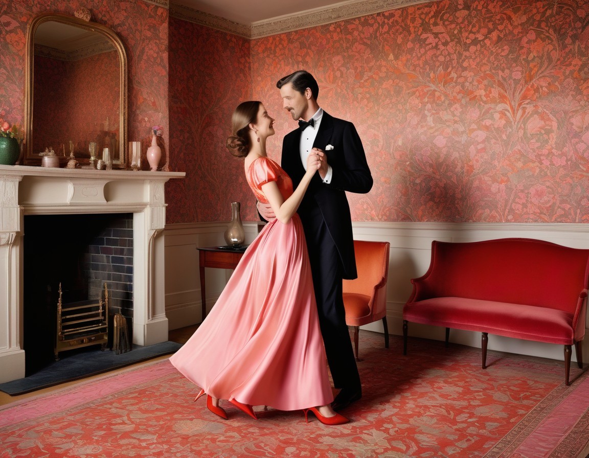 A couple dressed in formal attire dance intimately in an elegant room with vintage decor.